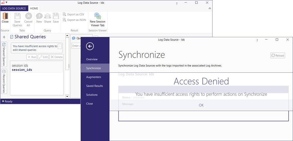 Depending on the assigned access roles in Teneo Manager for a given Log Data Source and user, the Log Data Source window will display an "Access Denied" message in the backstage tabs for which permissions are not granted to the current user while buttons may be greyed out in the Home window and the user will not be able to access these functionalities (unless the user obtains the right access roles). Of course, if the user has other access roles assigned, the functionalities related to the assigned roles are still accessible.