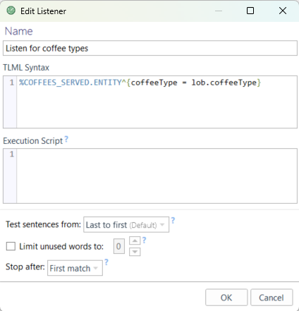 | Limit unused words to | Specifies a maximum number of words which the user input may contain (beside those matching the TLML syntax) for the match to be satisfied. The Listener will only execute if the TLML Syntax has fewer unused words than the defined limit. | |
